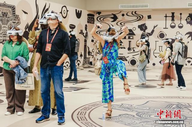 在探访良渚古城遗址公园时,埃及作家埃兹丁·曼苏拉·穆罕默德·埃尔赛义德体验了“神纹之约”VR项目。