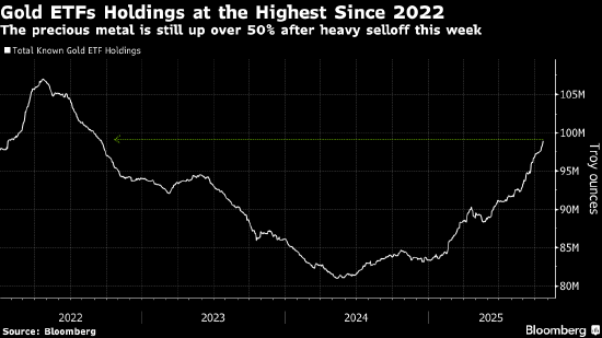 彭博汇总的全球数据显示,截至周二,黄金ETF持仓总量攀升至9890万金衡盎司,创2022年9月16日以来的最高水平。