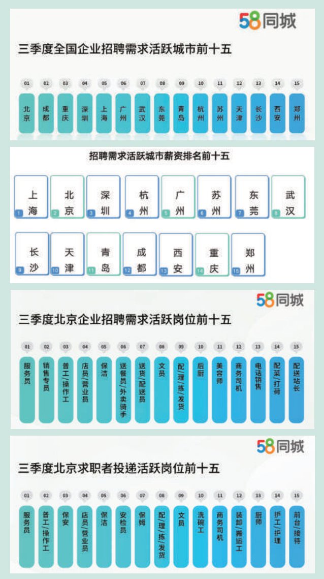 “北京就业市场的亮眼表现,反映出首都在稳就业、扩岗位方面的综合实力,也说明薪资结构正向技能型与稳定型岗位倾斜,生活服务业的专业化与细分化趋势明显。”58同城研究院相关负责人表示。