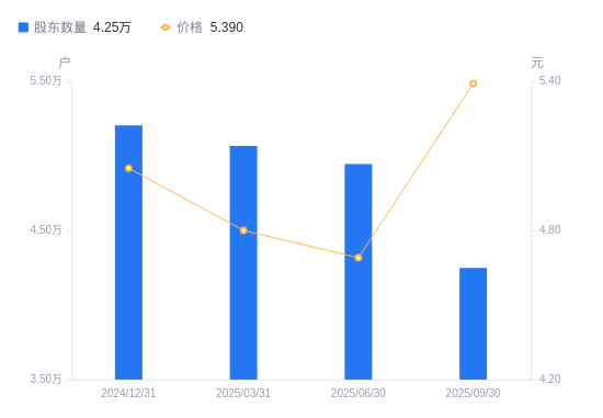 近一年(2024年9月30日至2025年9月30日),盘江股份A股股东户数从4.53万户,减低至4.25万户,降幅6.14%,区间股价上涨0.37%。