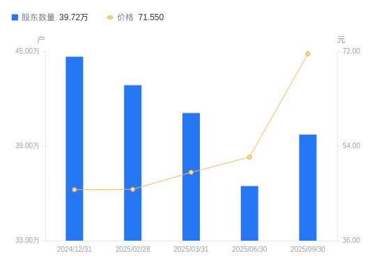 10月27日消息,数据显示,截至2025年9月30日,A股股东总户数为39.72万户,较上期(2025年6月30日)增加3.26万户,增幅8.94%。公司最新A股总股本为63.79亿股,其中流通A股63.79亿股,户均持有流通A股数量为1.61万股,较上期减少1435.76股,降幅8.21%;户均持流通A股市值114.9万元,较上期增加24.1万元,增幅26.55%。