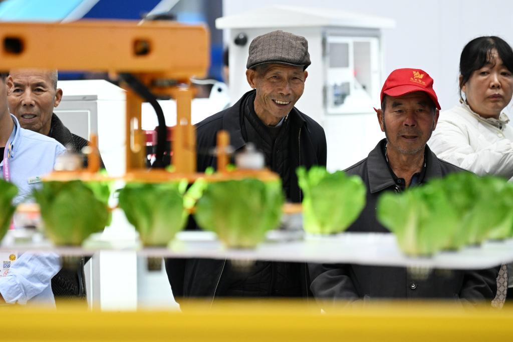 10月25日,参观者在杨凌农高会上参观“无人化植物工厂成套技术装备创制及应用”项目成果。新华社记者李一博 摄