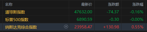 截至收盘,道琼斯指数跌0.16%,报47632点;标普500指数跌0.3点,报6890.59点;盘中两只指数一度刷新高,但在美联储主席鲍威尔讲话后明显回落。