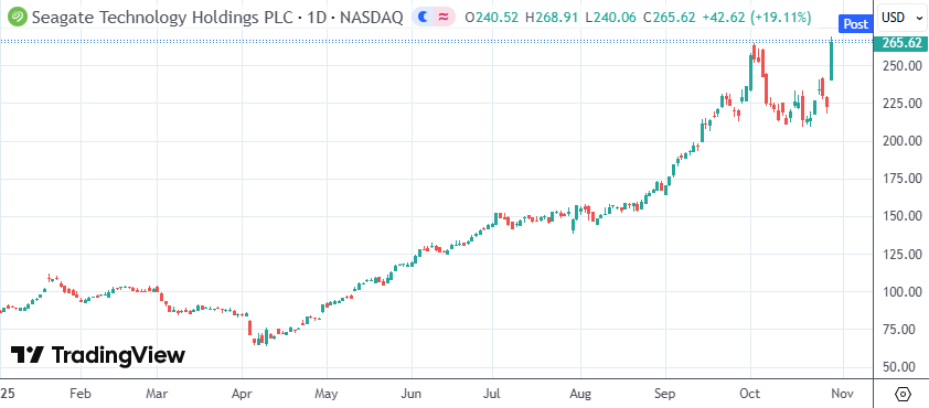存储概念股大幅走强,希捷科技涨19.11%,SanDisk涨16.42%,西部数据涨13.18%,Rambus涨7.37%。