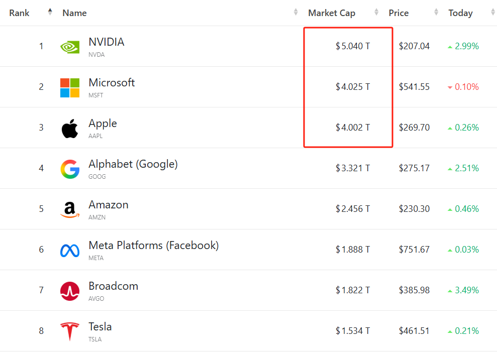 苹果涨0.26%报269.70美元也创新高,总市值为4.002万亿美元;微软跌0.10%,市值为4.025万亿美元——这意味着美股首次在收盘时出现三家市值超4万亿美元的公司。