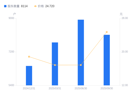 10月30日消息,数据显示,截至2025年9月30日,A股股东总户数为8114户,较上期(2025年6月30日)减少809户,降幅9.07%。公司最新A股总股本为2.49亿股,其中流通A股2.41亿股,户均持有流通A股数量为2.97万股,较上期增加2692.46股,增幅9.97%;户均持流通A股市值73.41万元,较上期增加27.91万元,增幅61.33%。